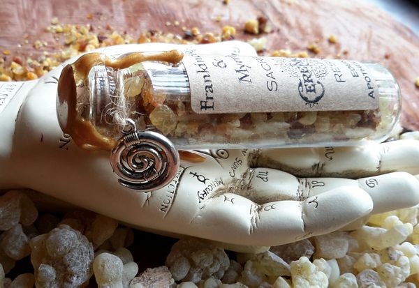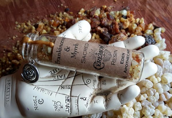 I then place the blended resin into a glass vial and cork. The bottled blend is placed on an altar of ceremony and allowed to cure, cultivating the energetic vibrations of 1 whole Moon Cycle. Transforming this potion through the magic of Lunar Alchemy