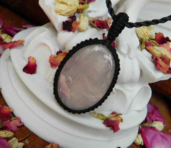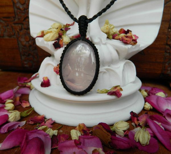 Offering to you a cabochon style hand knotted Rose Quartz Crystal Pendant, with hand knotted chord, which when worn sits beautiful right over the hear energy.