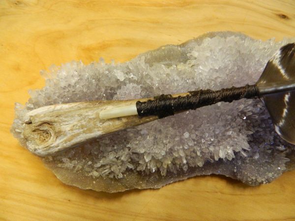 The wedge shaped peice of wood has a circular indent at the base. It represents the energetic vortex of manifestation. I have gentley sealed this peice of wood with local beeswax from Tanja, before mounting the feather on using a hand knotting trechnique. With each knot is said a blessing.